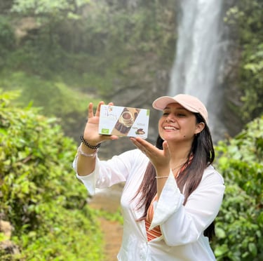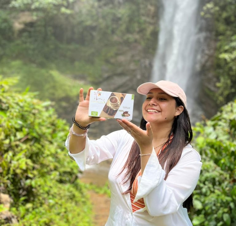 Hands gently holding fresh cacao pods against a lush green backdrop of Quillabamba's jungle.